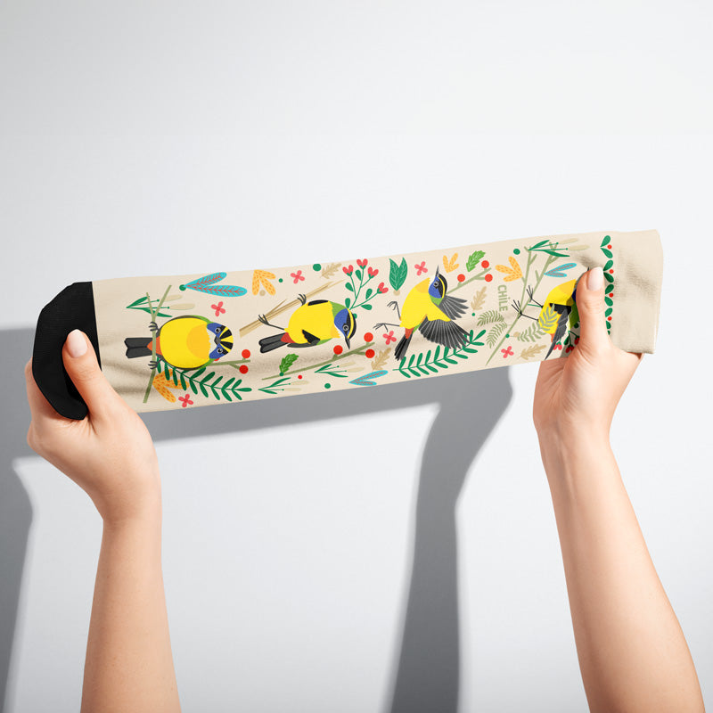 Transforma tu outfit con nuestros calcetines que no sólo mantienen tus pies protegidos del frío, sino que también cuentan una linda historia sobre Chile.